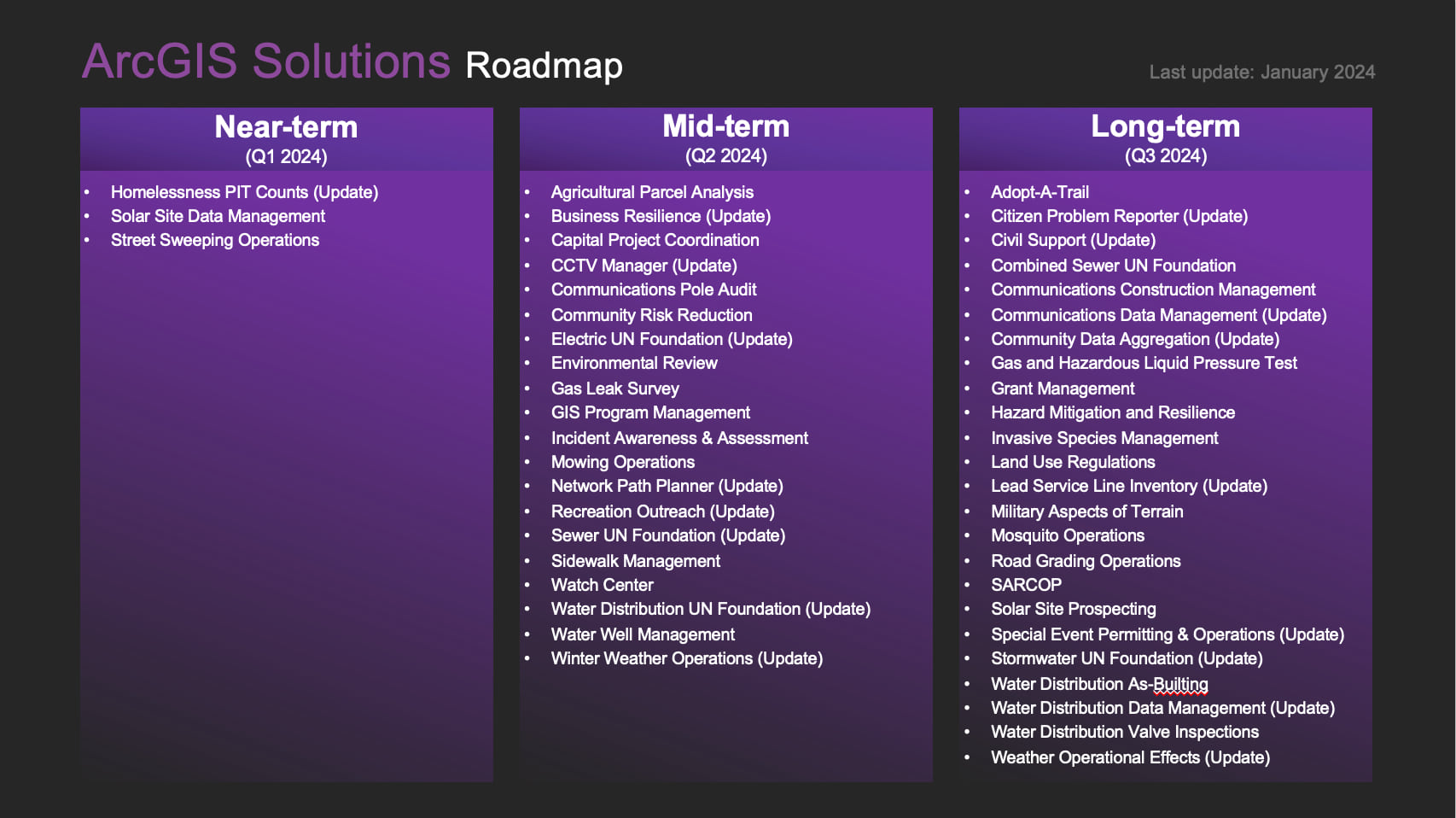 This ArcGIS Solutions Roadmap gives you a sneak peek of the major capabilities we are focused on in 2024. Near-term will be available in Q1 2024 and mid-term in Q2 2024. Long-term capabilities are in the plan and slated for a Q4 2024 release but we will revise this roadmap mid-year to ensure it reflects our latest plans.